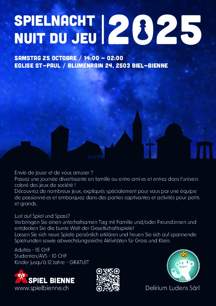 En plus des jeux disponibles et expliqués sur place, wir bieten verschiedene Aktivitäten an. Des concours, des présentations de jeux inventés par des créateurs présents avec nous, Registrierung für komplexe Spiele, et bien plus encore !